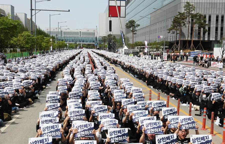 삼성전자 초기업노조는 23일 오후 삼성전자 평택캠퍼스에서 성과급 상한 폐지 등을 골자로 한 '4·23 투쟁 결의대회'를 개최했다. 오후 1시부터 시작된 결의대회에는 경찰 추산 3만여 명, 노조 추산 3만9000여 명이 참석했다.