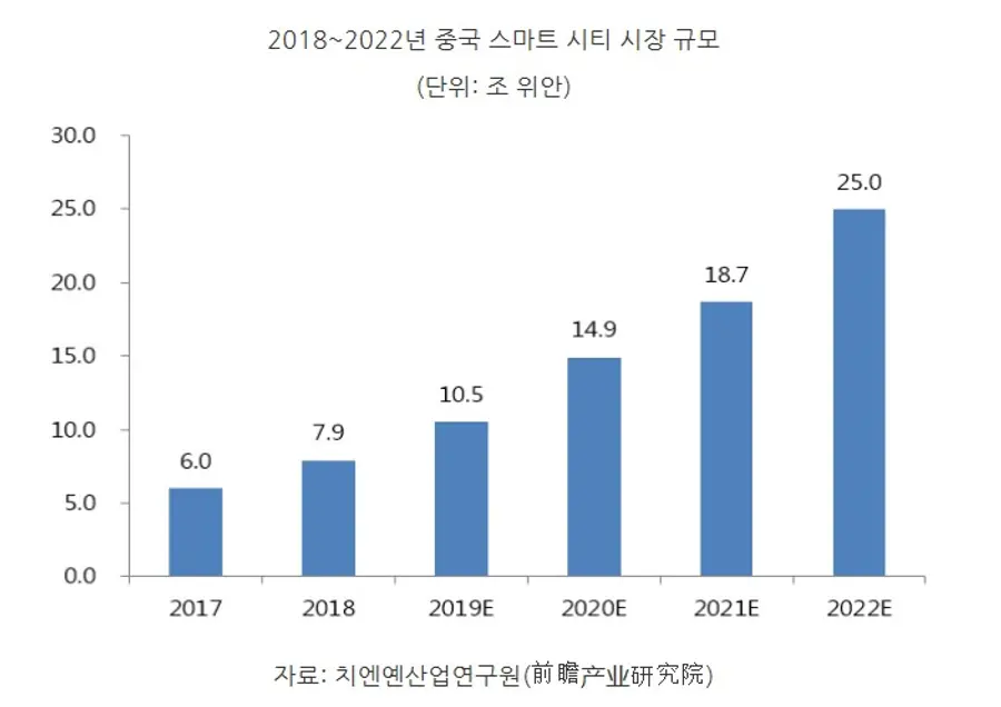 치엔옌산업연구원(前瞻产业研究院)에 따르면 중국의 스마트 시티 시장 규모는 2018년에 7조9000만 위안을 기록했고 2019년에는 10조 위안을 돌파할 것으로 전망된다. 아울러 2018년부터 2022년까지 중국 스마트 시티의 연평균 성장률은 33.38%로 예상되며, 2022년 시장규모는 25조 위안에 달할 것으로 전망되고 있다.