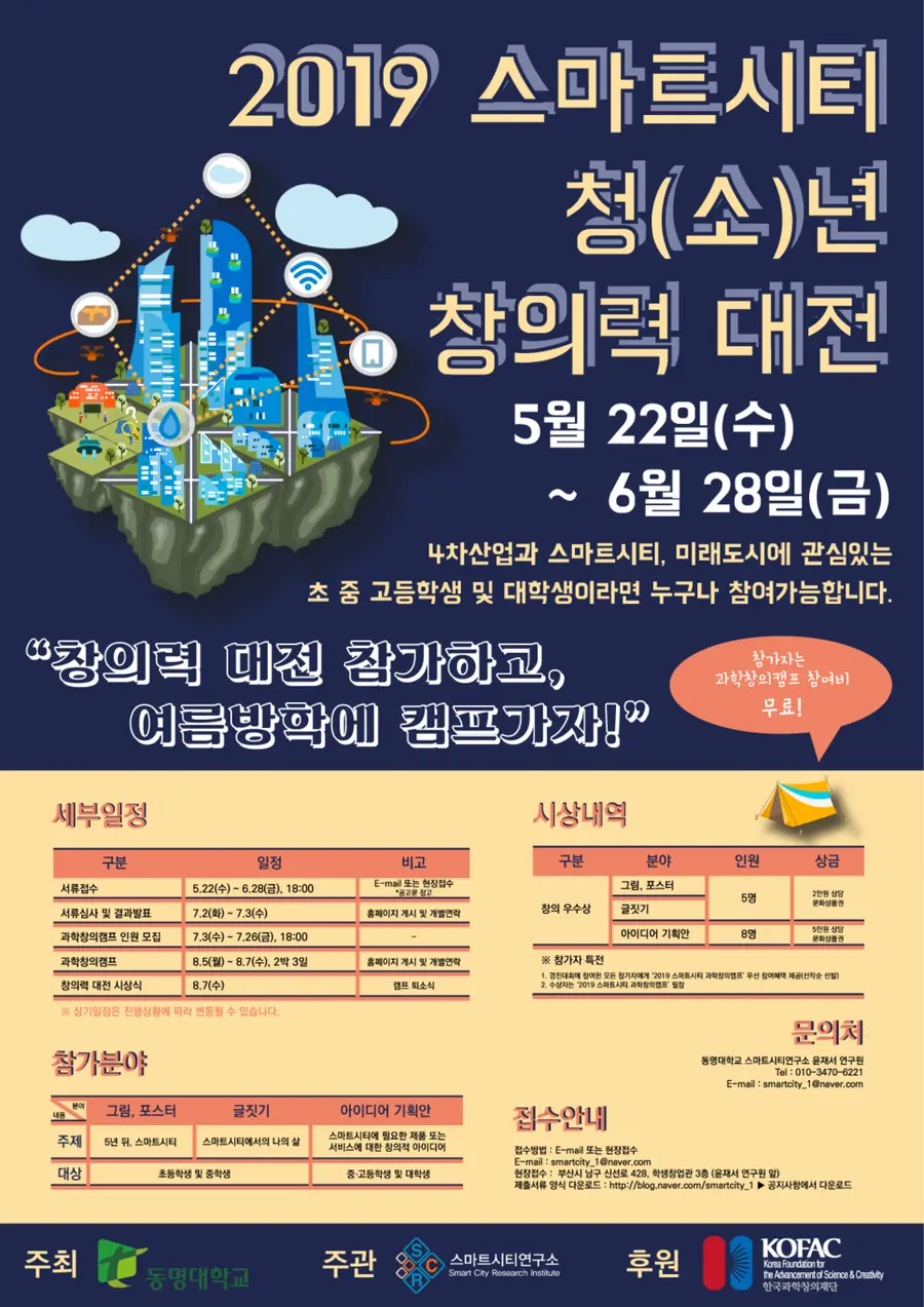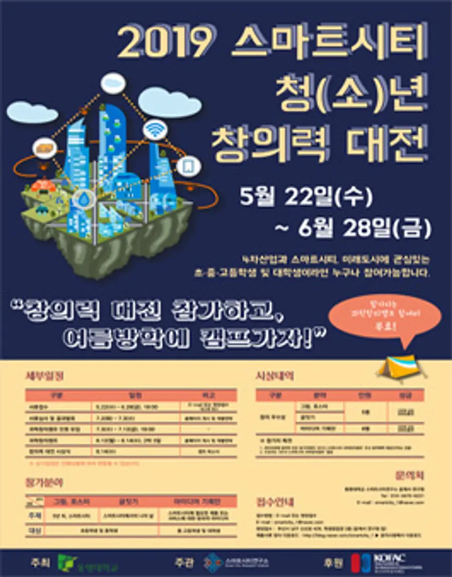 신청자격은 4차 산업혁명과 스마트시티, 미래도시에 관심있는 초∙중∙고등학생 및 대학생이고 모집분야는 아래와 같다.