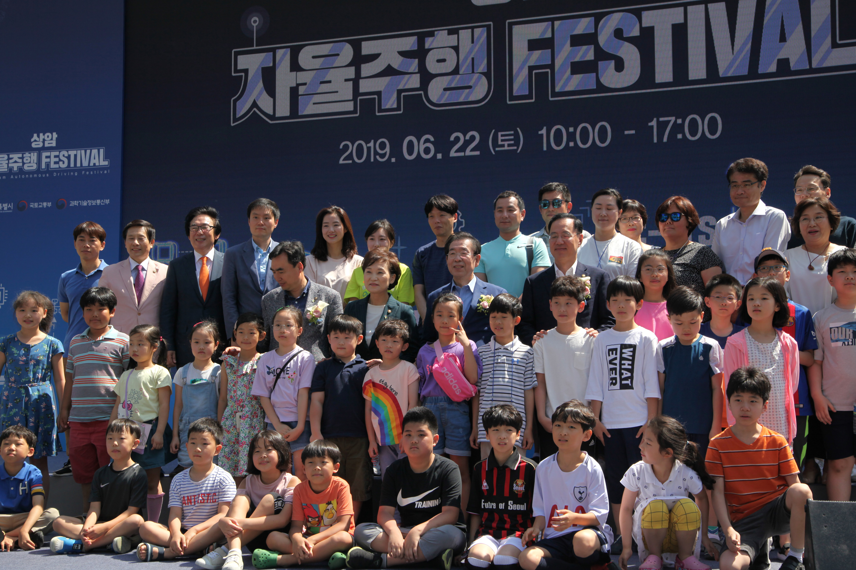 22일 오전 서울 마포구 상암 문화광장에서 열린 '상암 자율주행 페스티벌'에서 김현미 국토교통부 장관, 박원순 서울시장 등 내빈들이 초청 가족들과 기념촬영을 하고 있다.