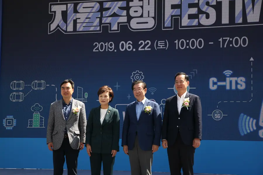 윤관석 국회 국토교통위원회 더불어민주당 간사(왼쪽부터), 김현미 국토교통부 장관, 박원순 서울시장, 민원기 과학기술정보통신부 제2차관이 22일 오전 서울 마포구 상암 문화광장앞에서 열린 상암 자율주행 페스티벌 기념식에서 기념촬영을 하고 있다.