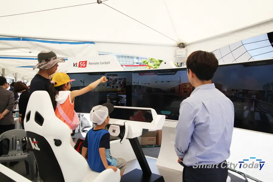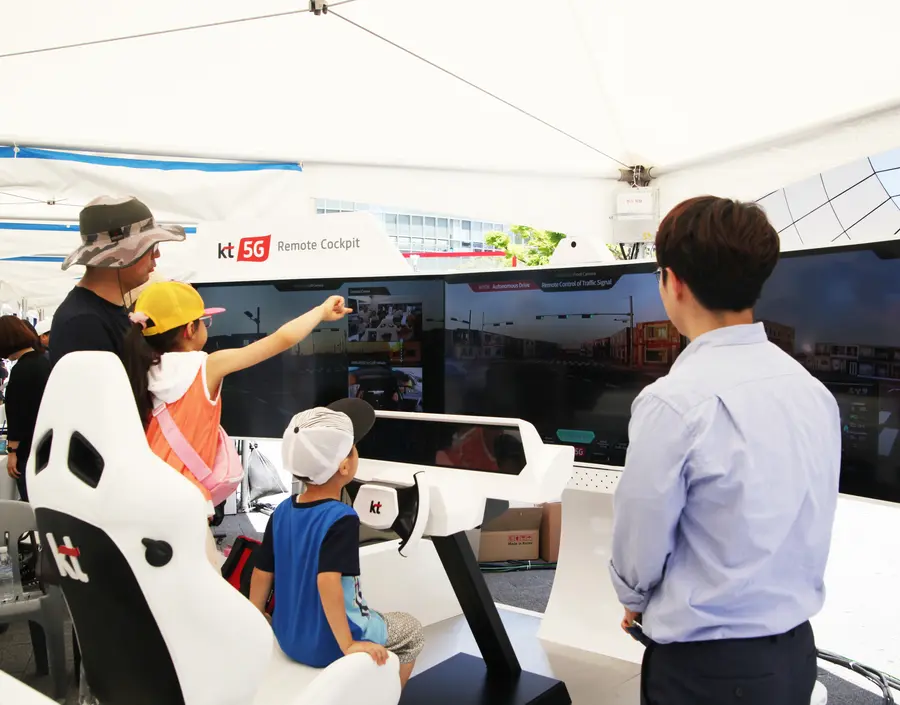 22일 오전 서울 마포구 상암동에서 열린 상암 자율주행 페스티벌에서 시민들이 자율주행 차량 원격 제어가 가능한 5G 리모트 콕핏을 체험하고 있다.
