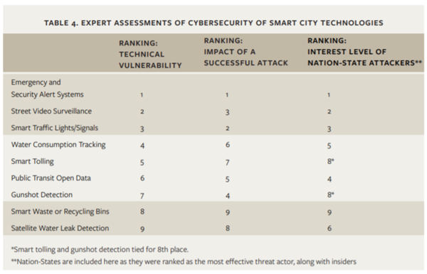 사이버보안 전문가 76명이 기초기술 취약점, 해커에 대한 매력, 심각한 사이버 공격 성공 가능성에 따라 9개 공통 스마트시티 기술 평가를 바탕으로 한 이 보고서는 가장 취약한 스마트시티 시스템으로 비상 경보, 비디오 감시 도구 및 스마트 신호등을 꼽고 있다. 스마트 폐기물 및 재활용 쓰레기통 및 위성 누수 감지 시스템은 다른 기술에 비해 취약성이 낮은 것으로 평가했다.