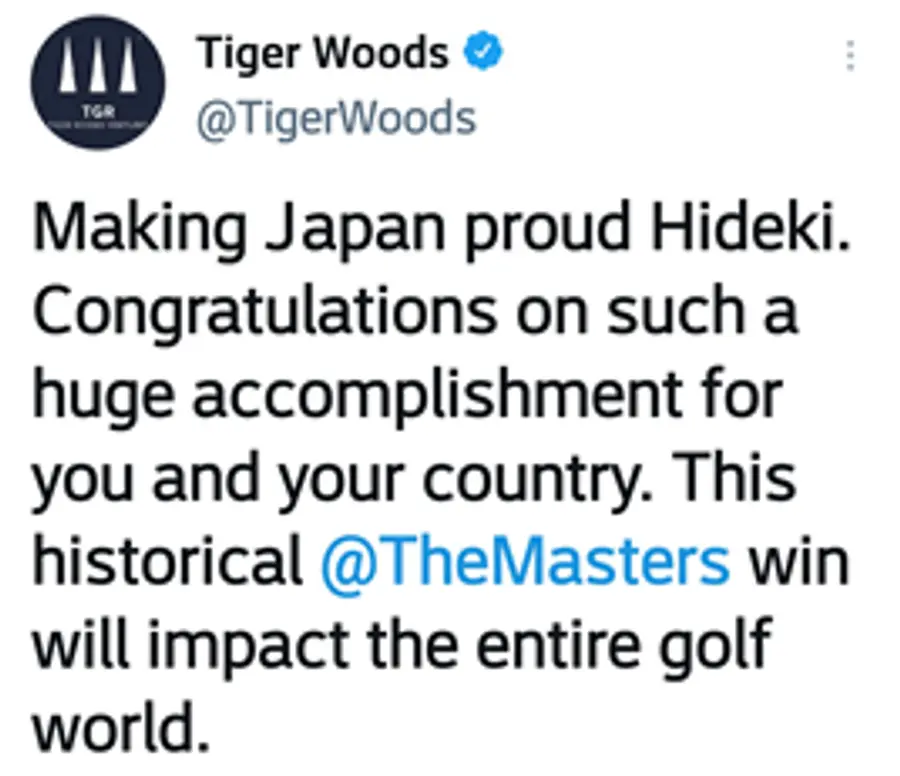 "일본에 자부심을 안긴 히데키. 당신과 당신의 나라를 위해 이렇게 큰 성과를 거둔 것을 축하한다. 이 역사적인 마스터스 우승은 골프계 전체에 영향을 미칠 것이다."
