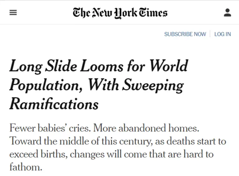 이 같은 가설을 바탕으로 국가적 과제로 추진되고 있는 스마트시티의 전제가 뒤집히고 있다는 보도가 전해졌다. 그것도 세계적인 언론인 뉴욕타임즈를 통해서 말이다. “Long Slide Looms for World Population, With Sweeping Ramifications.”이라는 제목으로 보도된 기사를 국내 언론은 “빈집 흔해져버린 지구촌…인구 팽창시대 막내린다”라는 제목으로 받았다.