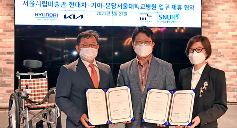 Hyundai Motor and Kia Motor signed a business agreement with the Seoul National Museum of Modern and Contemporary Art and Seoul National University Bundang Hospital to promote mobility convenience enhancement of people with limited mobility.