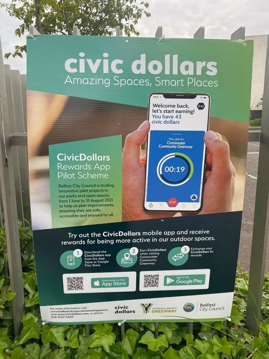 이 서비스는 컨스워터 커뮤니티(Connswater Community)의 그린웨이(Greenway)에서 시범 운영이 시작됐으며 다른 공원으로 확대되고 있는 중이다. 그린웨이 공원 이용자는 30분에 1시민달러를 벌 수 있으며 하루에 최대 5달러까지 벌 수 있다. 시민들은 또한 공원 내 기물파손를 신고하여 확인될 경우 신고 건당 1시민 달러를 벌 수 있다.