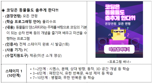(코딩은 동물들도 춤추게 한다?!) 순차, 반복 등 기초적인 코딩 개념을 동물들의 댄스파티라는 주제로 미션을 해결하는 블록 코딩 프로그램