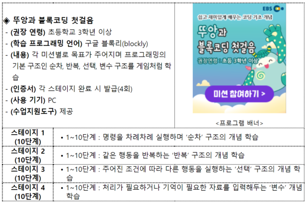 (점박이와 코딩을!) EBS 애니메이션 ‘점박이: 한반도의 공룡’의 캐릭터들과 함께 3차원 입체 환경에서 장애물을 극복하는 블록코딩 프로그램