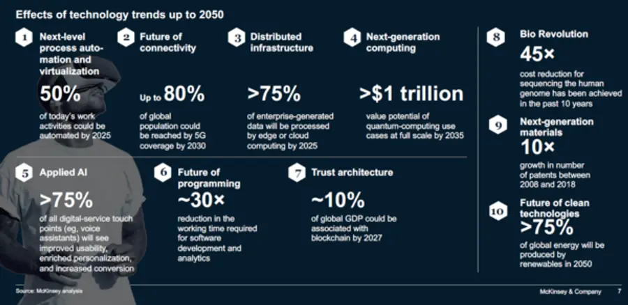 여덟번째 트렌드는 생물과학의 진보가 컴퓨팅, 자동화, AI의 가속화와 맞물려 바이오 레볼루션이라는 새로운 혁신의 물결을 일으키고 있는 것을 반영한다. 이러한 트렌드는 경제와 우리 생활에 중대한 영향을 미칠 것이며 건강과 농업에서부터 소비재, 에너지, 재료에 이르기까지 산업에 영향을 미칠 것이다. '오믹스(유전체(遺傳體), 전사체(transcriptome), 단백질체(proteome) 등 생물학적정보 총망라적인 해석에 관여하는 학문체계. omics)'와 분자 기술이 포함된 생체분자의 혁명 차원은 생물학에서 가장 빠르게 성장하고 최첨단으로 진화했지만 생체기계, 바이오 컴퓨팅, 바이오 시스템도 중요한 차원으로 꼽힌다. 어떤 혁신은 이 혁명이 어떻게 진행되어야 하는지에 대한 진지하고 지속적인 논쟁을 주장하는 생물학의 자생적이고, 복제적이며, 상호 연결된 본질에 뿌리를 둔 심오한 리스크를 동반하기도 한다.