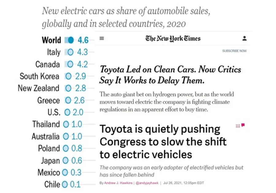 IEA의 '2021글로벌 EV 전망' 보고서가 밝힌 미국의 신차 판매중 전기차가 차지한 비율(2020년 기준)이 우리나라는 물론 세계 평균보다 낮은 2%에 불과한 이유 중이 하나가 세계최대 자동차 메이커 중의 하나인 일본 도요타의 로비과 연관이 있는 것으로 밝혀져 주목을 끌고 있다.