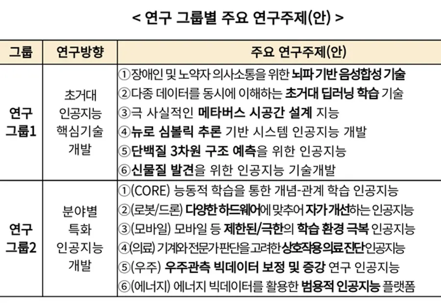 K-Hub의 연구 그룹들은 핵심원천 기술 확보를 위한 초거대 인공지능 개발과 로봇, 드론, 모바일, 의료, 에너지 등 분야별 특화 인공지능 연구를 주요 방향으로 정하고, 각 그룹이 세부 주제에 대한 연구를 수행할 예정이다.