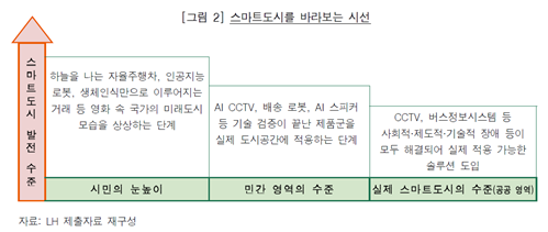 일반 국민은 하늘을 나는 자율주행차, 인공지능 로봇 등 현재의 기술과 제 도로는 제공하기 어려운 서비스까지 모두 구현된 미래도시를 스마트도시라고 생각하는 경향이 있으나, 지금까지 공공 영역에서 추진된 스마트도시 조성사업은 정보통신망, 폐쇄회로텔레비전(CCTV) 등 기초인프라 구축을 중심으로 이루어져 왔기 때문에 [그림 2]와 같이 스마트도시를 조성하는 자와 실제 이용하는 자 간에 스마트도시를 바라보는 시선에 차이가 있다.