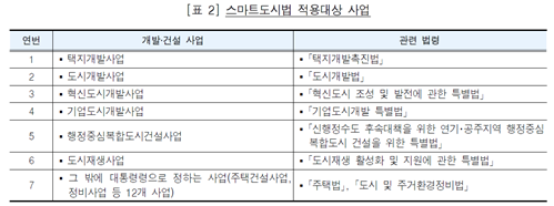 스마트도시법 제2조, 제3조 및 제12조에 따르면 스마트도시건설사업이란 스마트도시계획에 따라 스마트도시서비스를 제공하기 위하여 스마트도시기반시설 등을 구축·운영하는 사업을 말하며, 국가, 지방자치단체, LH 등은 「택지개발촉진법」의 택지개발사업 등 [표 2]의 각 사업을 스마트도시건설사업으로 시행할 수 있다.