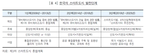 한편, 스마트도시 조성과 관련한 정책 역시 위와 같은 제도적 여건 변화 등에 따라 [표 4]와 같이 단계적으로 확장, 진화해왔다.