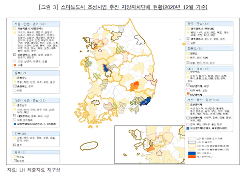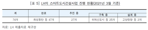 한편, 이번 감사의 대상으로 선정한 LH가 시행한 택지 등 개발지구 내 스마트도시건설사업 현황을 살펴보면, [표 5]와 같이 LH는 2021년 3월 현재 화성동탄 등 74개 스마트도시건설사업지구(화성시 등 67개 지방자치단체)에 대하여 스마트도시 기반시설 구축사업을 완료하였거나 추진하고 있다.