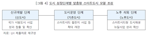 이에 따라 [그림 4]와 같이 3단계로 도시를 구분하고, 도시 성장단계별로 맞춤형 스마트도시 모델을 조성하기 위해 각 단계의 특성에 맞춰 국가 시범도시 사업, 스마트시티 챌린지 사업, 스마트시티형 도시재생 뉴딜사업 등을 추진하고 있다.