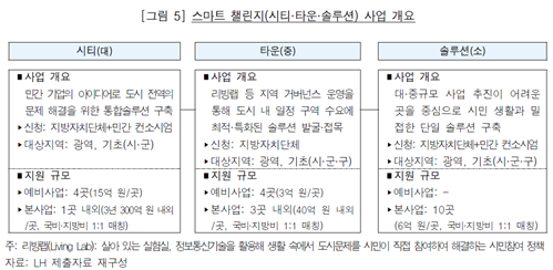 스마트 챌린지 사업은 민간 기업을 중심으로 지방자치단체·시민의 수요를 반영하여 기존도시에서 발생하는 교통·환경·안전 등 다양한 도시문제에 대한 솔루션을 발굴하는 방식의 사업으로, [그림 5]와 같이 사업 규모에 따라 시티(대), 타운(중), 솔루션(소) 세 가지 유형으로 추진되고 있다.