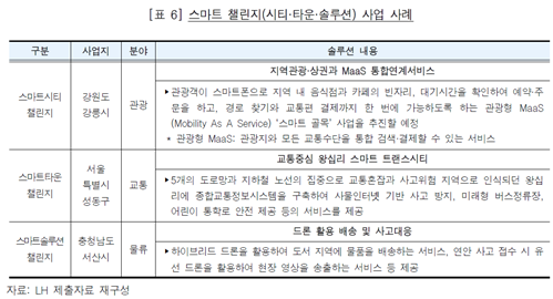 2021년 1월까지 [표 6]과 같이 강원도 강릉시 등 31개 도시에서 120여 개 솔루션이 실험 중이며, 국토부는 기존도시의 다양한 도시문제를 해결함과 더불어 스마트도시에 대한 국민 체감도를 높이기 위해 향후 예산을 확대 편성하여 스마트 챌린지 사업을 전국으로 확산해 나갈 계획이다.
