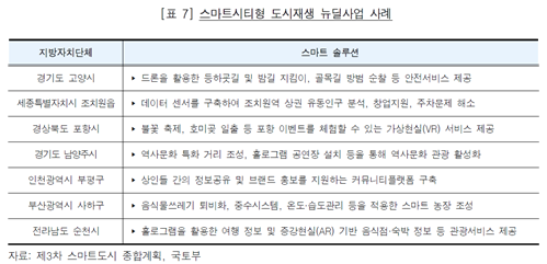 국토부는 지역에 특화된 스마트 솔루션을 도시재생 뉴딜사업에 적용할 수 있도록 각 지방자치단체로 하여금 도시재생 활성화 계획을 수립하도록 하고 있는데, 2019년 7월까지 [표 7]과 같이 경기도 고양시 등 7곳이 위 도시재생 활성화 계획을 수립하였다.