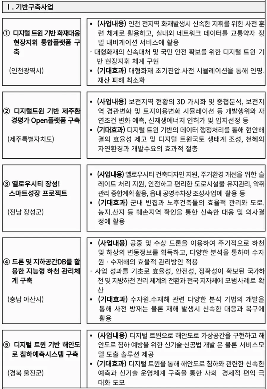 '디지털 트윈 국토’는 한국판 뉴딜 10대 대표과제로서, 국토와 동일한 가상세계를 3차원으로 구현하여 국토의 지능적 관리와 국민 삶의 맞춤형 문제해결을 위한 국가 위치기반의 플랫폼을 말한다.