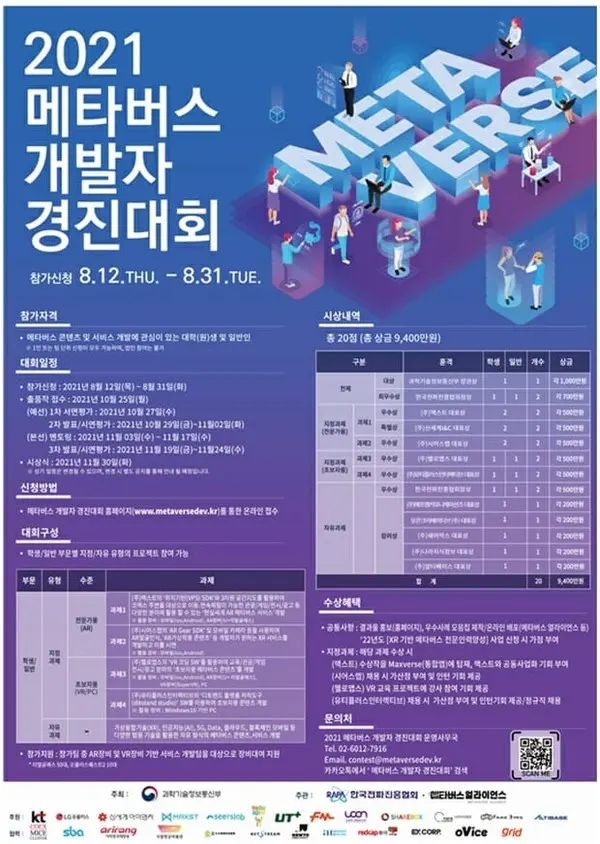 Any university students and ordinary people who are interested in metaverse are able to participate in the event, and the final 20 outstanding teams will be selected to receive 94 million won in the prize, Science and ICT Minister's Award (1 point), Korea Association President's Award (4 points), and sponsor's CEO Award (15 points).