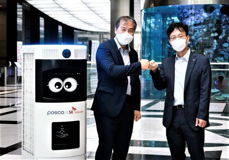 SK텔레콤과 포스코는 산업안전 분야에서 자율주행 로봇과 드론을 활용해 작업장 내 방역을 하거나 위험 및 이상징후를 탐지하는 기술과 솔루션 개발에 나설 예정이다. 이를 위해 양 사는 8월 17일 자율주행 방역로봇 ‘Keemi’를 서울 강남 포스코센터에 구축하고 시범 운행에 들어갔다.