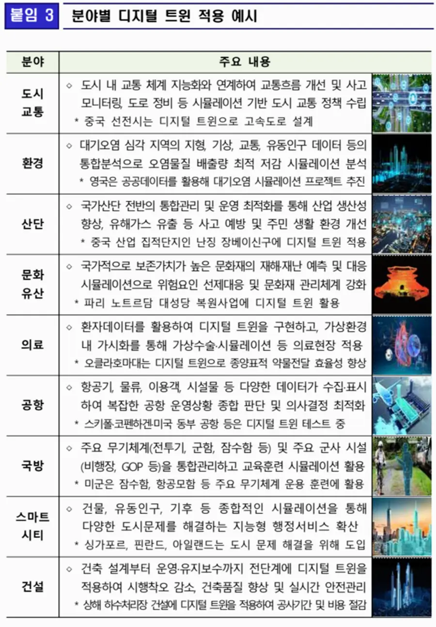 △정부는 제조·물류·의료 등 주요 산업별로 디지털 트윈 서비스를 적용하여 생산 및 운영의 효율화를 추진할 계획이다.