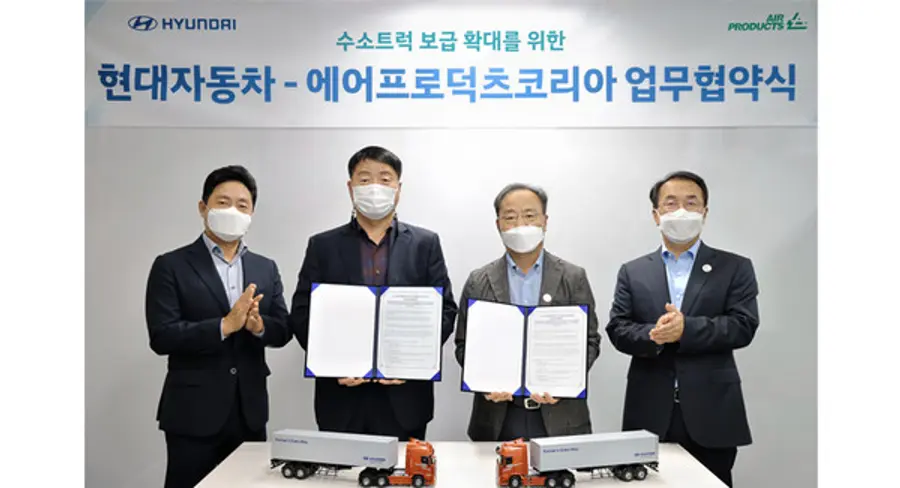 현대자동차는 지난 9일(목) 에어프로덕츠 코리아 사옥(서울시 강남구 소재)에서 유원하 현대자동차 국내사업본부장, 김교영 에어프로덕츠 코리아 대표이사 등 주요 관계자들이 참석한 가운데 ‘수소상용차 보급 확대를 위한 양해각서(MOU) 체결식’을 진행했다고 밝혔다.