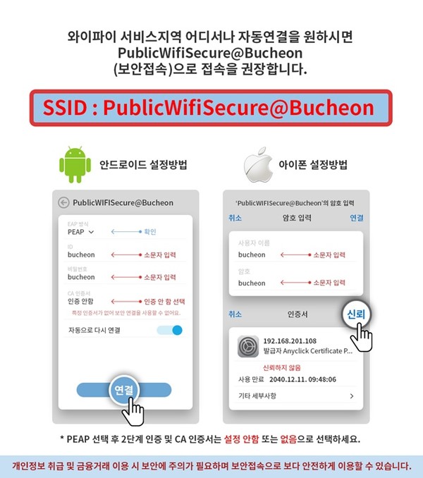 시민들은 스마트폰 와이파이 접속화면에서 ’PublicwifiSecure@Bucheon’을 선택 후 ID와 비밀번호 입력란에 ‘bucheon’을 입력하면 이용이 가능하다.