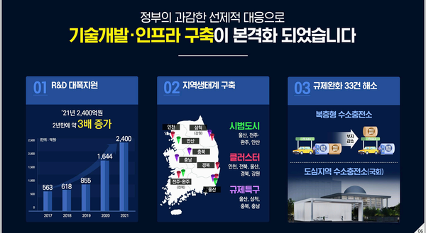 우리 정부는 수소경제의 잠재력과 무한한 가능성을 보고, 새로운 길을 개척하는데 주저하지 않았습니다. 2019년 1월, ‘수소경제 활성화 로드맵’을 발표하고, 수소차, 충전소, 기술 개발, 안전 등 분야별 대책을 수립하여 힘있게 추진했습니다. 수소법을 세계 최초로 제정하고, 범정부 수소경제위원회를 출범시켜 수소 지원체계도 확립했습니다. 예산도 매년 증액하여 우리 정부 출범 초기 750억 원 수준에서 내년에는 17배 이상 증가한 1조3천억 원 수준으로 대폭 확대했습니다.