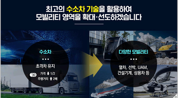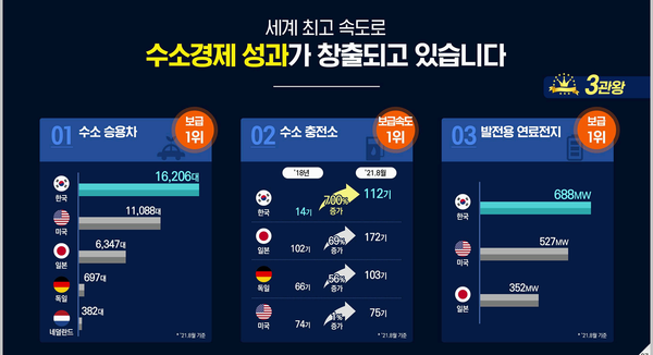 정부의 적극적인 지원과 기업들의 과감한 투자가 더해져 수소산업 생태계가 활성화되고 수소 경제가 빠르게 성장하고 있습니다. 특히, 수소 활용 분야인 수소차와 수소연료전지는 세계 1등 선도국가의 위치를 굳건히 차지하고 있습니다. 수소승용차 보급량과 세계 시장 점유율 1위 자리를 확고히 지키고 있고 수소트럭, 트램, 청소차, 지게차, 도시버스, 드론, 선박 등 다양한 수소 모빌리티가 수출되거나 활용 또는 실증되고 있습니다. 발전용 연료전지 보급량도 세계 1위를 기록하고 있고, 지난 9월 처음으로 해외에 수출하는 성과도 이뤘습니다.