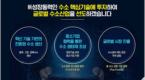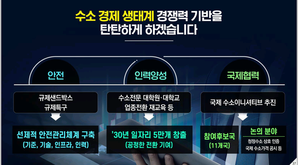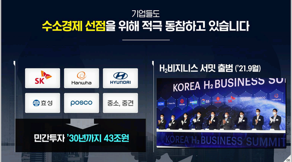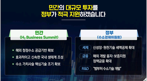 정부는 글로벌 수소기업 30개 육성과 일자리 5만개 창출을 위해 민간 투자에 세액공제와 같은 각종 금융 패키지를 전폭 지원, 세계를 선도하는 "수소 코리아"를 실현해나가기로 했다.