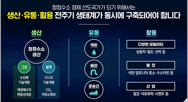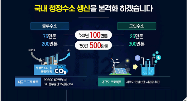 우리나라가 수소 선도국가로 나아가기 위해서는 보다 담대하고 도전적인 미래 비전과 전략이 필요합니다. 특히 탄소중립과 함께 수소경제로 확실히 나아가기 위해서는 부생수소, 추출수소 등 그레이수소 기반을 블루수소, 그린수소 등 청정수소 중심으로 대전환을 이뤄내는 것이 필수적 과제입니다. 이를 위해 청정수소 생산 역량을 빠르게 늘리고, 다양한 분야에서 수소 사용이 확대되어야 합니다. 정부는 ‘청정수소 선도국가’를 대한민국의 핵심 미래전략으로 삼아 강력히 추진해 나가겠습니다.