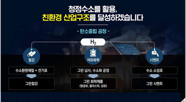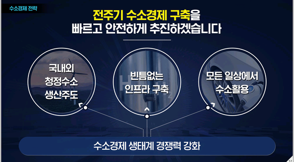 셋째, 수소 활용이 일상화되는 탄소중립 대한민국을 실현하겠습니다. 수소승용차 시장의 글로벌 초격차를 수소버스, 트럭, 건설기계 등 상용차 시장으로 확대하고 도심항공, 트램, 드론, 선박 등 미래 교통과 운송수단에 수소를 적용하여 친환경 모빌리티 시장을 선도하겠습니다. 발전 부문에서는 수소 발전에 특화된 지원을 강화하고, 친환경 수소와 암모니아 기반의 발전시스템으로 에너지 전환에 속도를 내겠습니다. 또한 철강산업에서도 수소환원제철 기술로 탈탄소화를 이뤄냄으로써 철강산업의 경쟁력을 지키면서 탄소중립을 실현해 나가겠습니다.