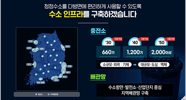 둘째, 언제 어디서나 수소를 쉽게 충전할 수 있고, 전국 곳곳에 수소를 공급할 수 있는 빈틈없는 인프라를 구축하겠습니다. 2050년까지 2,000기 이상의 수소충전소를 구축할 것이며, 전 국민이 2030년에는 20분 이내, 2050년에는 10분 이내에 편리하게 충전소를 이용할 수 있는 환경을 조성할 것입니다. 또한, 경제적이고 안전한 액화수소 인프라 구축으로 대규모 청정수소 유통망을 활성화할 것이며, 전국적인 배관망을 순차적으로 구축해 갈 것입니다.