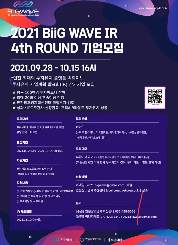 Hosted by Incheon Metropolitan City and organized by the Incheon Center for Creative Economy and Innovation, Big Wave will recruit companies to participate in the IR presentation (Investment Attraction Business Plan Presentation).