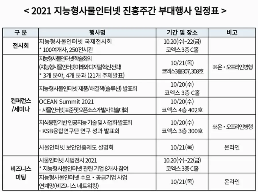 ▷이 밖에도 지능형사물인터넷 제품·솔루션 발표회(10.20), 지능융합기반 인공지능(AI) 기술 및 사업화 발표회(10.20), OCEAN Summit 2021(10.20), 지능형사물인터넷 수요·공급기업 비즈니스 네트워킹(10.21)이 개최된다.
