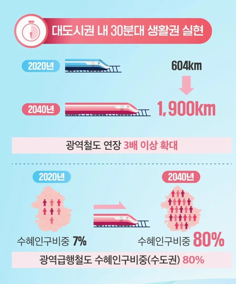 대도시권 내 광역철도 연장이 3배 이상 확대된, 주요 선진국 수준의 편리한 광역교통망 구축을 통해 '30분 도시'가 구현된다.