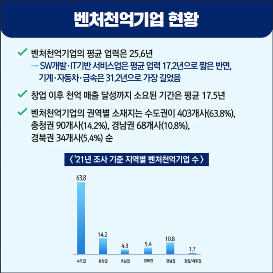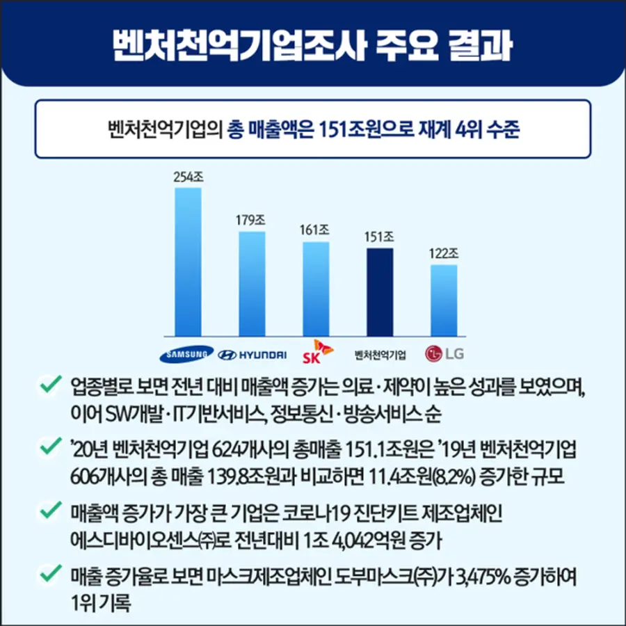 이번 조사는 '98년 벤처확인제도 시행 이후 1회 이상 벤처확인 이력이 있는 기업 116,778개사 중 '20년 기준 매출액이 1,000억원 이상인 벤처기업을 대상으로 한 결과이다.