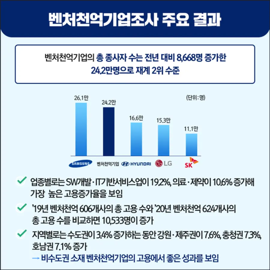 중소벤처기업부(장관 권칠승)는 22일 '20년말 기준 벤처천억기업 633개사의 고용·매출·수출 현황, 연구개발(R&D)과 산업재산권 등을 분석한 '2020 벤처천억기업조사' 결과를 발표했다