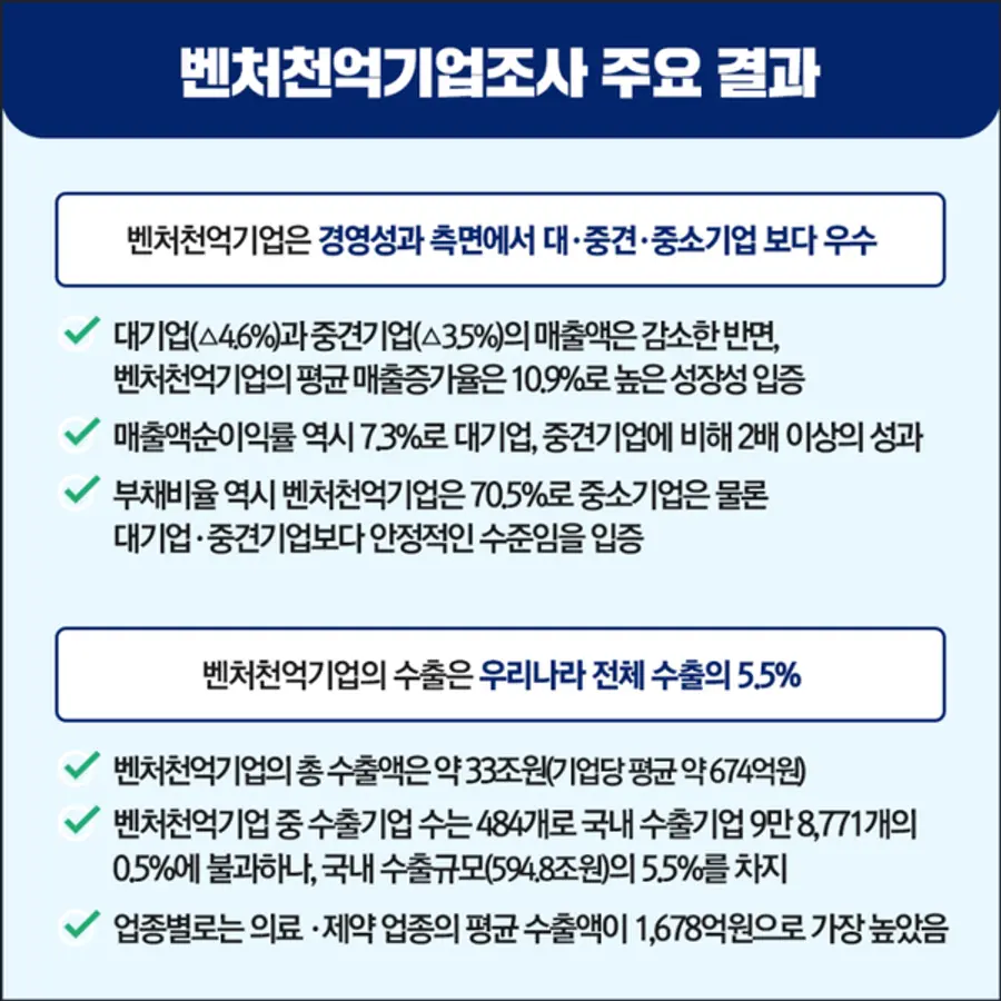 중기부 박용순 벤처혁신정책관은 “벤처 투자를 받은 기업과 벤처기업들이 많은 일자리를 창출하고 있는 것으로 조사되었듯이, 벤처천억기업들도 많은 일자리를 창출하여 우리 경제의 버팀목 역할을 하고 있다는 점을 입증한 조사”라면서, “스타트업과 벤처기업들이 유니콘기업, 벤처천억기업으로 성장할 수 있는 토양을 만드는 정책이 중요하며 벤처기업과 벤처투자 정책을 지속적으로 보완, 발전시켜 나가겠다”고 밝혔다.
