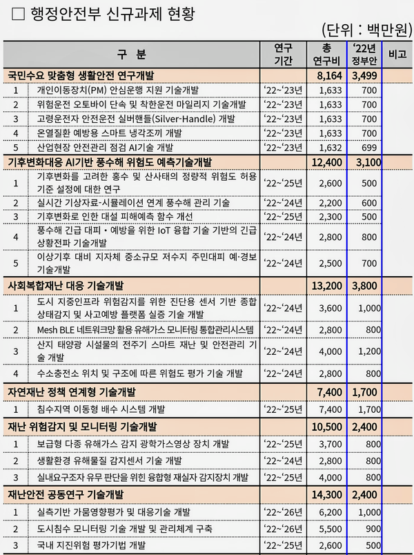 △기후변화를 고려한 홍수 및 산사태의 정량적 위험도 연구(5억원) △도시 지중인프라 위험감지를 위한 진단용 센서기반 플랫폼 개발(10억원) △재난 유형별 외상 후 스트레스 장애(PTSD) 평가방법 및 심리회복모델 개발(8억원) 등 51개이며, 357억원의 규모이다.