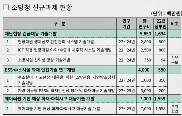 △현장대원 생체신호 안전관리 시스템 기술개발(8억원) △ICT 적용 현장대원 야외/수중 위치추적 시스템 기술개발(8억원) 등 6개 신규과제에 38억원 규모이다.