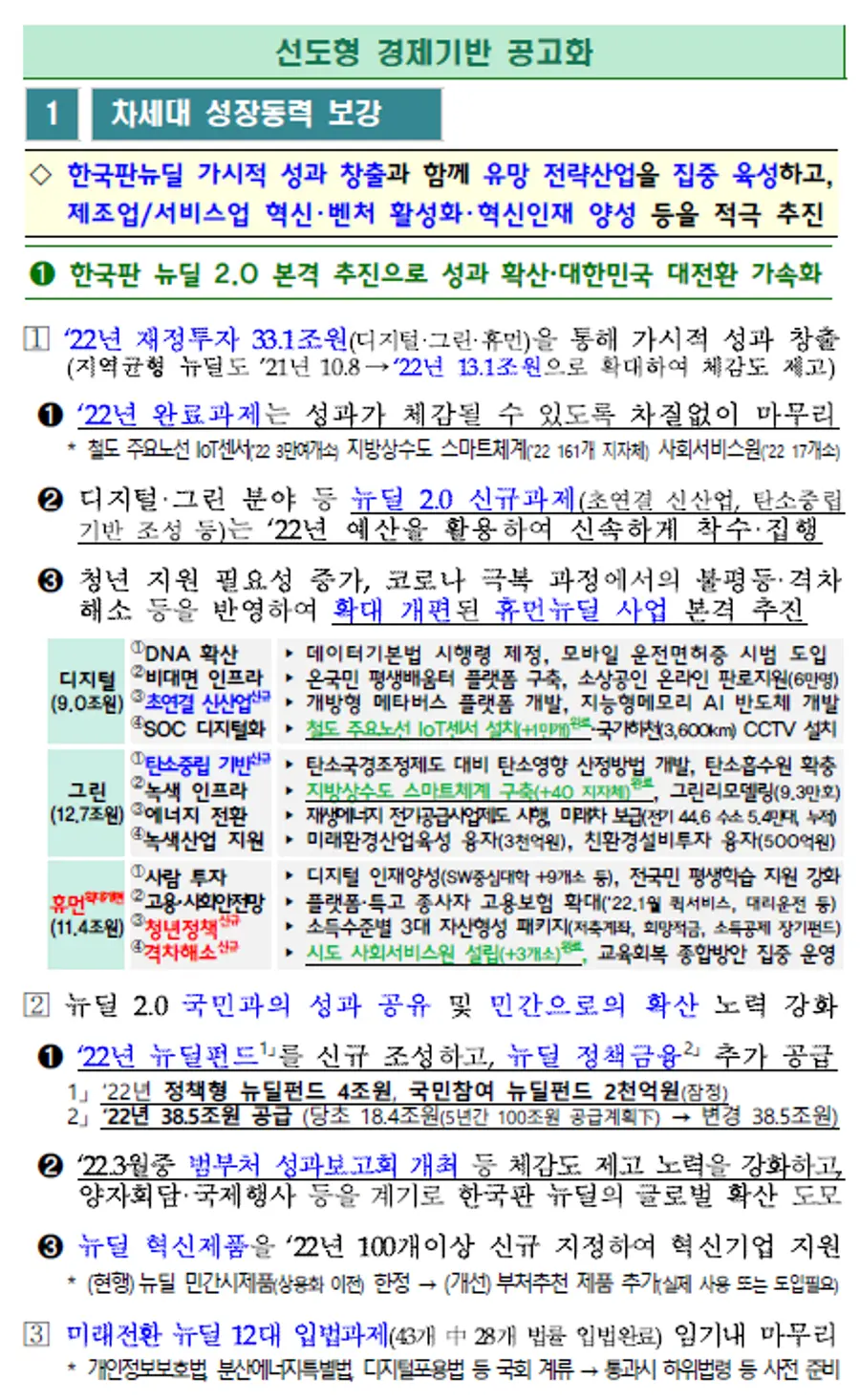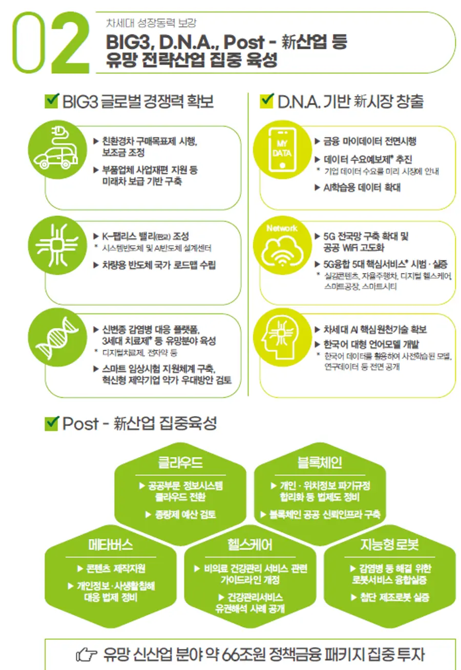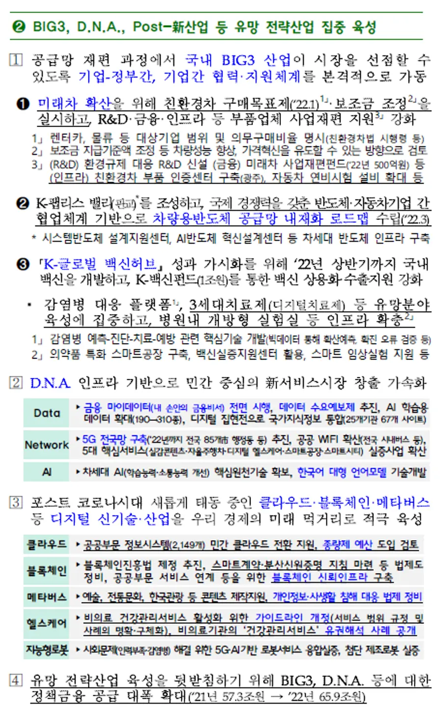 내년에 정부는 디지털, 그린, 휴먼 등 한국판 뉴딜 2.0에 33조원을 투입하고 미래차, 바이오헬스, 시스템반도체 등 혁신성장 3대 분야인 빅3에 6조3천억원 규모의 예산을 집중 투자한다.