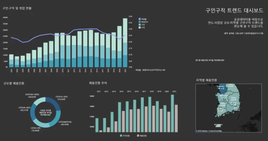 직장인 2인으로 구성된 ‘너굴맨’ 팀이 최우수상으로 선정됐으며, 여러 취업 통계 자료 및 공개 데이터를 활용하여 취업 동향 정보를 한눈에 볼 수 있는 대시보드를 개발하여 활용 가능성 측면에서 심사위원단의 호평을 받았다.