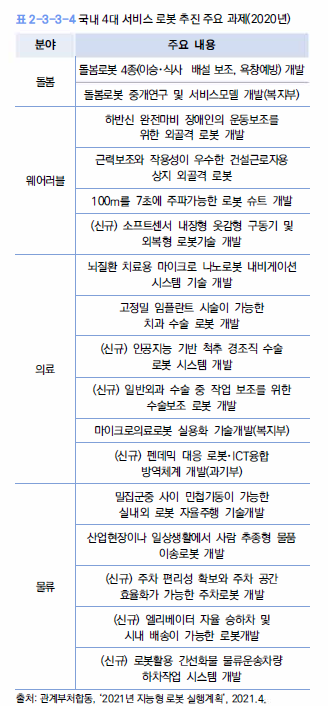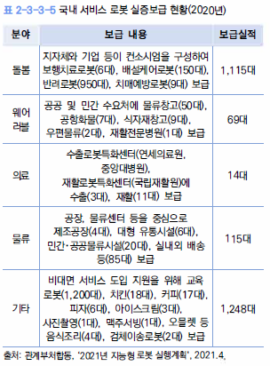 국내 주요 기업 동향을 보면, 대기업을 중심으로 스마트홈 로봇(LG전자), 자율주행 로봇(네이버), 웨어러블 로봇(삼성전자, 현대차) 등 서비스 로봇 제품이나 서비스를 개발·시험 중이다.