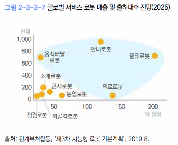 ▷지능형 로봇 서비스 확산을 위해 전 산업의 디지털 전환을 적극 강화해야 한다. 농업, 제조업, 서비스산업 등 전 산업으로 인공지능과 융합된 지능형 로봇 서비스 확산을 통해 제조 및 서비스 현장 비대면화·디지털화를 적극 추진해야 한다.