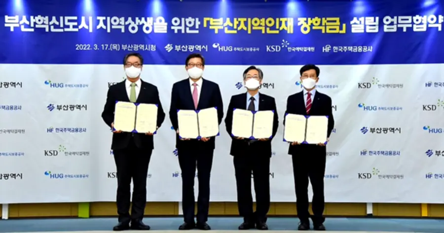 부산시는 17일 주택도시보증공사, 한국예탁결제원 및 한국주택금융공사와 함께 '부산지역인재 장학금 설립을 위한 업무협약'을 체결했다고 밝혔다.