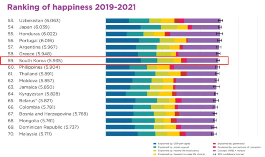 한국은 경제적으로는 선진국 대열에 들어갔으나 국가적인 행복 지수에서는 그리 높은 점수를 받지 못했다. 한국에서의 삶이 경제적인 지표나 대외적인 국가적 위치에 비해 많이 떨어지는 것으로 나타났다. 세계 행복 보고서에서 한국은 59위를 차지했다. 일본(54위)은 물론 남미의 아르헨티나, 또는 경제적으로 극심한 어려움을 겪고 있는 그리스에 비해도 떨어지는 순위다.